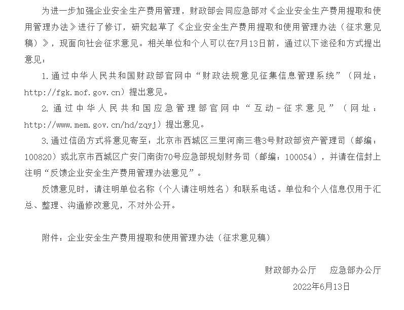 剛剛,應急管理部又重新發(fā)布征求意見稿,這意味著新修訂的《企業(yè)安全生產(chǎn)費用提取和使用管理辦法》將很快實施生效。2022年企業(yè)安全生產(chǎn)費用的提取和使用將迎來大變動。